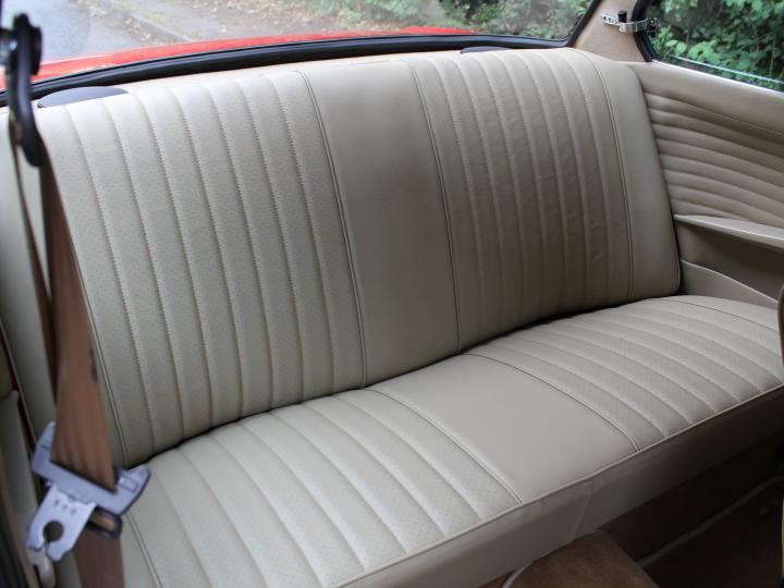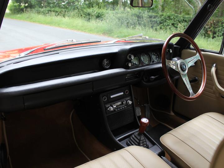 Upon first glance, the striking Red paintwork holds a deep finish with the recently refurbished chromework shining brightly throughout the exterior, enhancing the sleek bodylines of this sports saloon. Raising the car in the air reveals an excellent underside, testament to the quality of the thorough restoration. Inside the cabin you are greeted with beautiful beige leather seats, without any signs of wear contrasted beautifully by Mushroom Brown carpets and the Black leather dash. In the centre of the driver's gaze is a stunning Nardi wood-rim steering wheel that is both comfortable and sporty. The cleanliness and quality continues through to lifting the bonnet, where the powerplant sits among recently replaced or refurbished ancillaries and body-coloured inner wings.